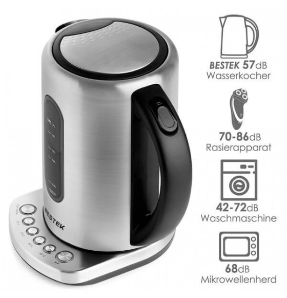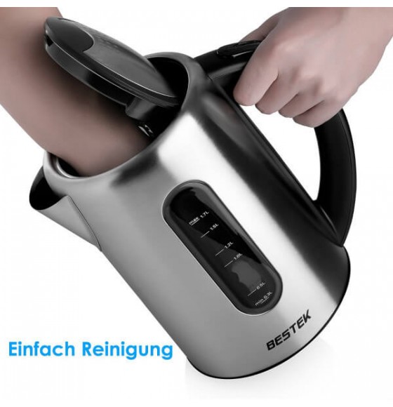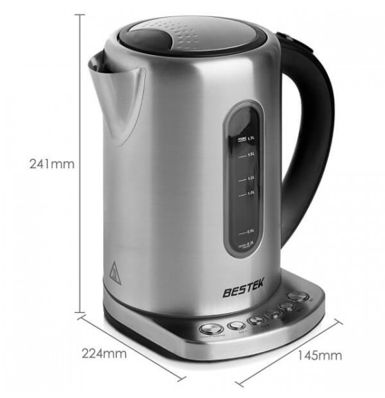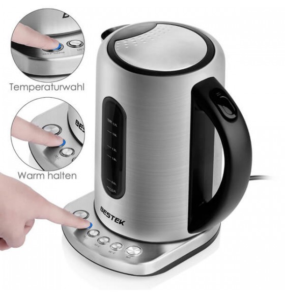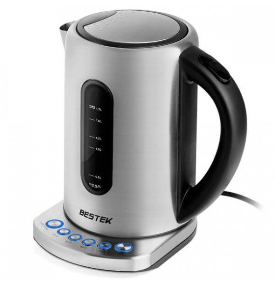BESTEK electric water kettle is made of BPA-free stainless material, durable and safe to use. 1.7L large capacity allows you to boil teas or coffees for whole family. Temperature control with auto shutdown function makes the kettle smart to protect your device from dry boiling and can keep the beverages at your favorite temperature for a long time.